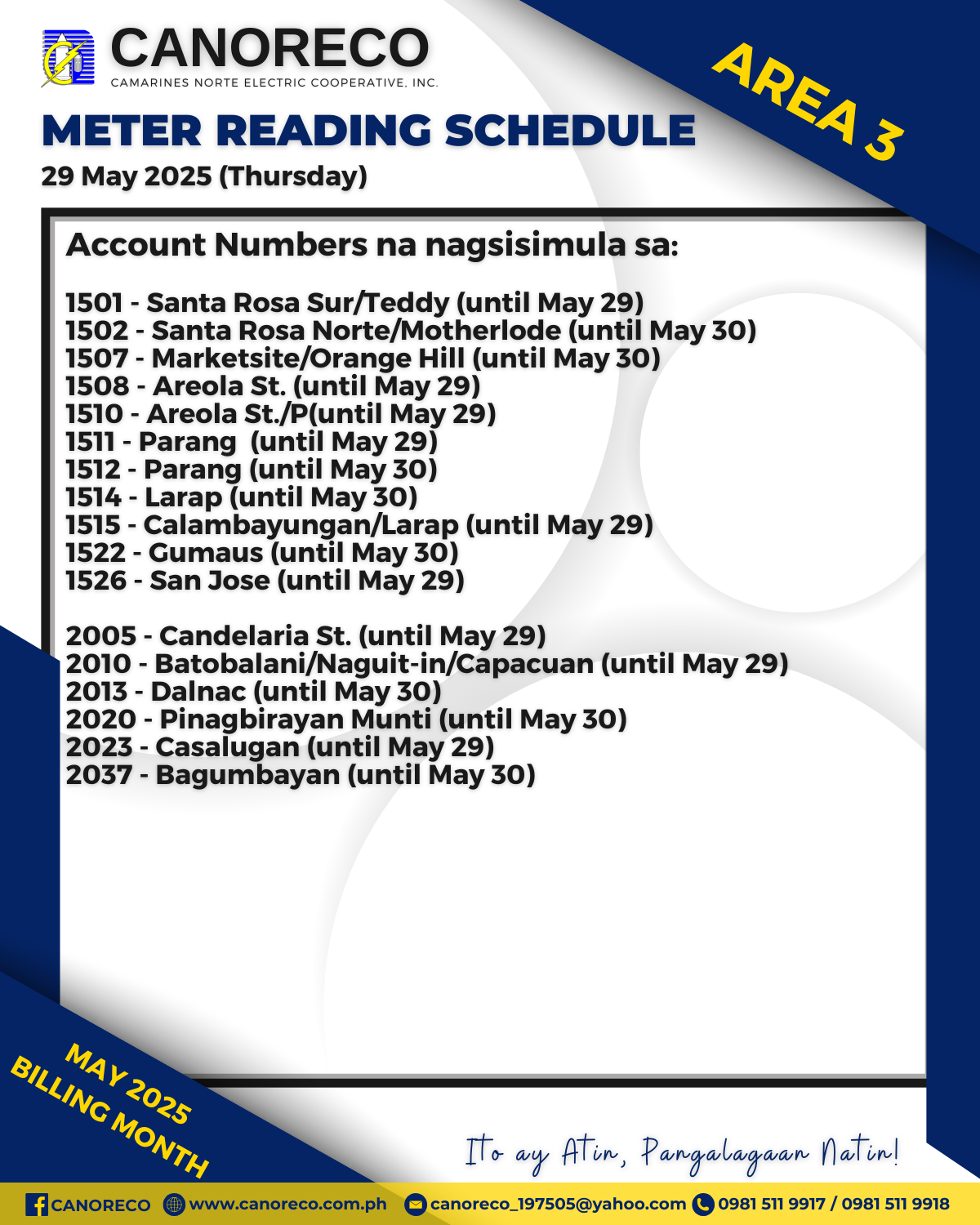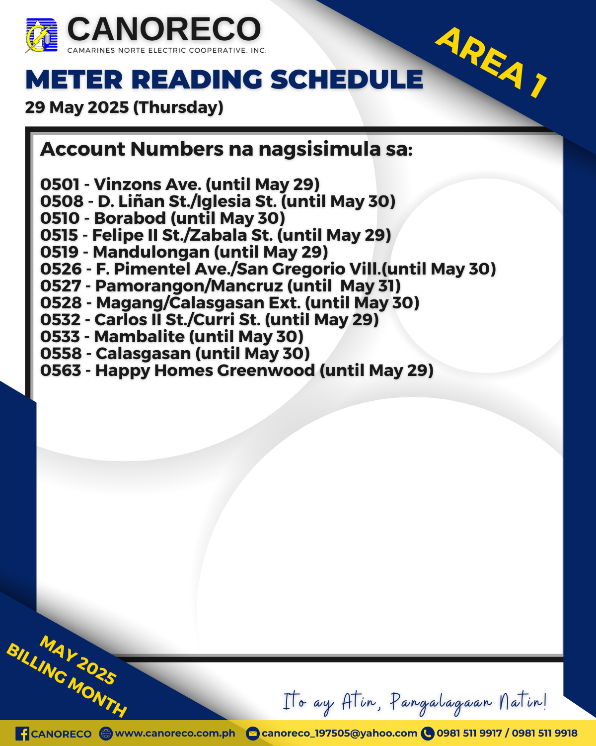 Paalala mga ka-MCO kung kailan mo maaaring matanggap ang iyong Electric Bill. Narito ang mga account numbers na scheduled for meter reading sa Area 1, 2, at 3 bukas, 29 May 2025 (Huwebes), para sa billing month ng MAY 2025.
