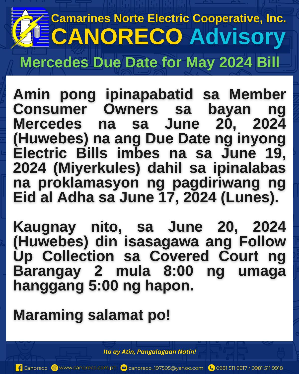Mga ka-MCOs sa bayan ng MERCEDES, sa June 20, 2024 (Huwebes) na po ang Due Date ng inyong Electric Bills imbes na sa June 19, 2024 (Martes) dahil sa ipinalabas na proklamasyon ng pagdiriwang ng Eid al Adha sa June 17, 2024 (Lunes).