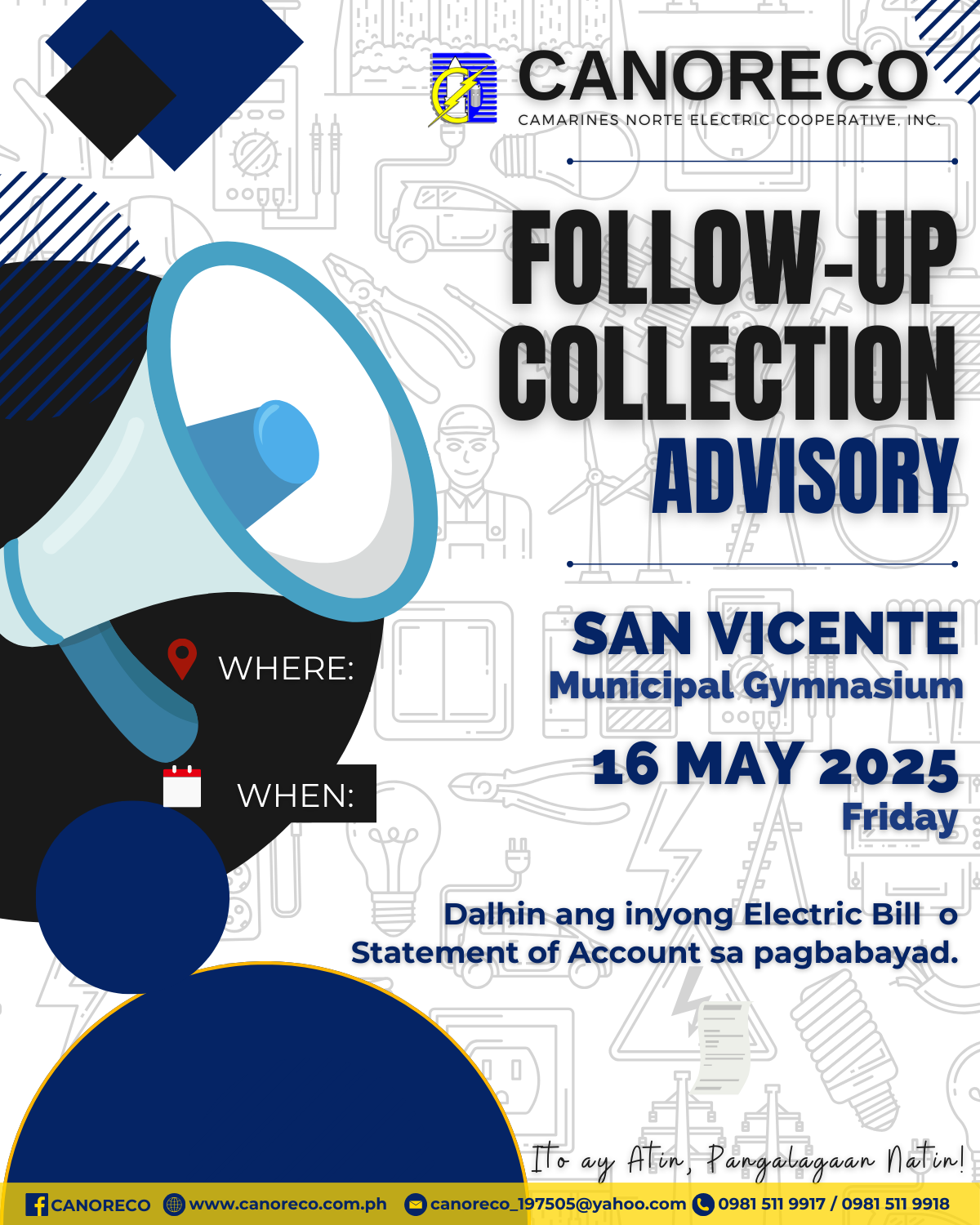 Mga ka-MCOs natin sa Bayan ng SAN VICENTE! Mayroon tayong follow-up collection riyan bukas, Biyernes (16 May 2025), sa Municipal Gymnasium. Dalhin ang inyong Electric Bill o Statement of Account sa pagbabayad. Kita-Kitz!