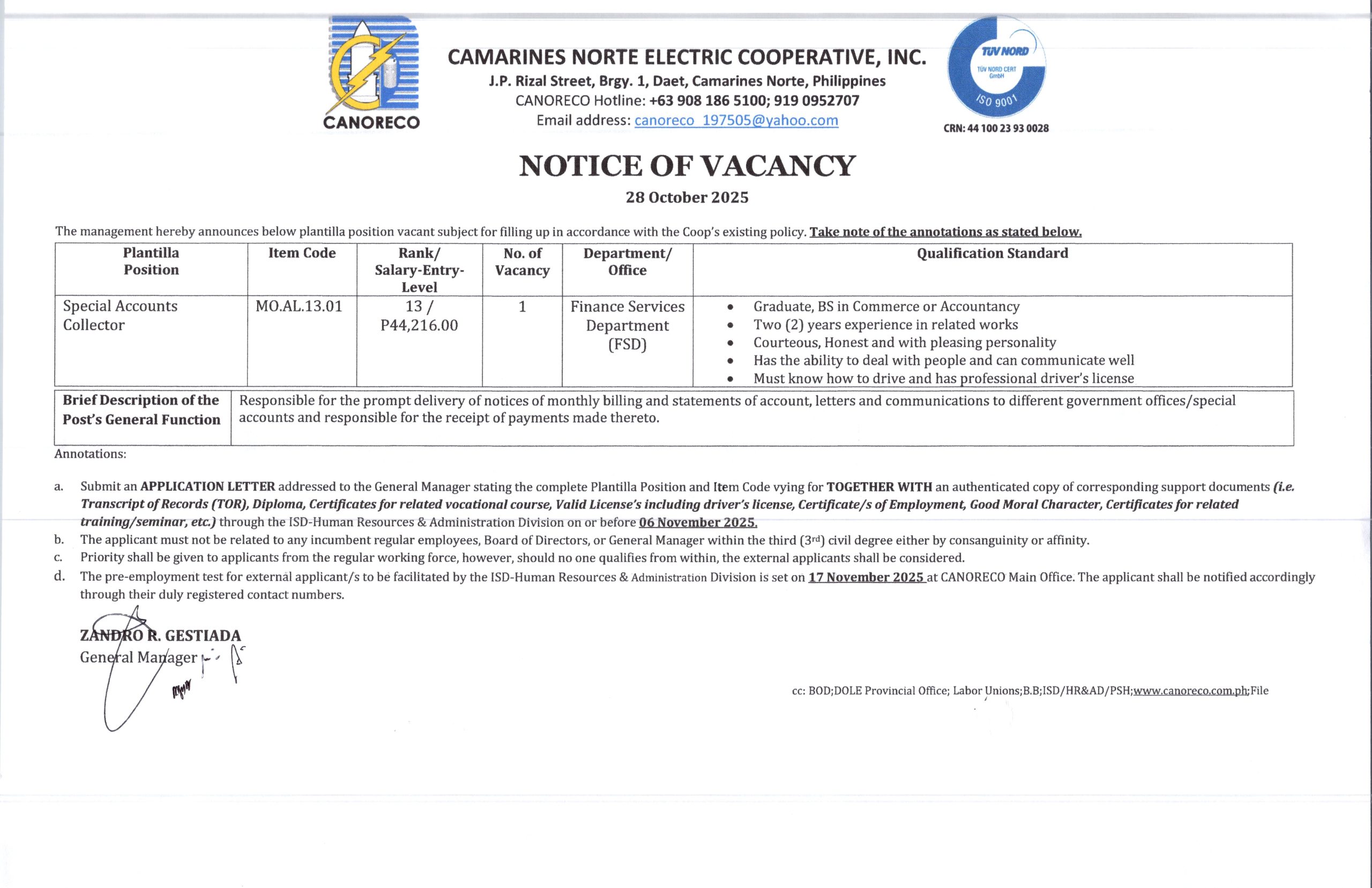 Notice of Vacancy Special Accounts Officer dtd 10282025 Posted on October 29, 2025 Author Comments Off on Special Accounts Officer dtd 10282025