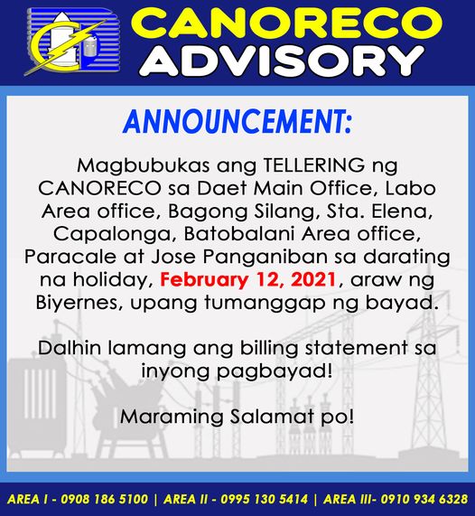 Magbubukas ang TELLERING ng CANORECO sa Daet Main Office, Labo Area office, Bagong Silang, Sta. Elena, Capalonga, Batobalani Area office, Paracale, at Jose Panganiban sa darating na Special Non Working Day, February 12, 2021, araw ng Biyernes, upang tumanggap ng bayad.