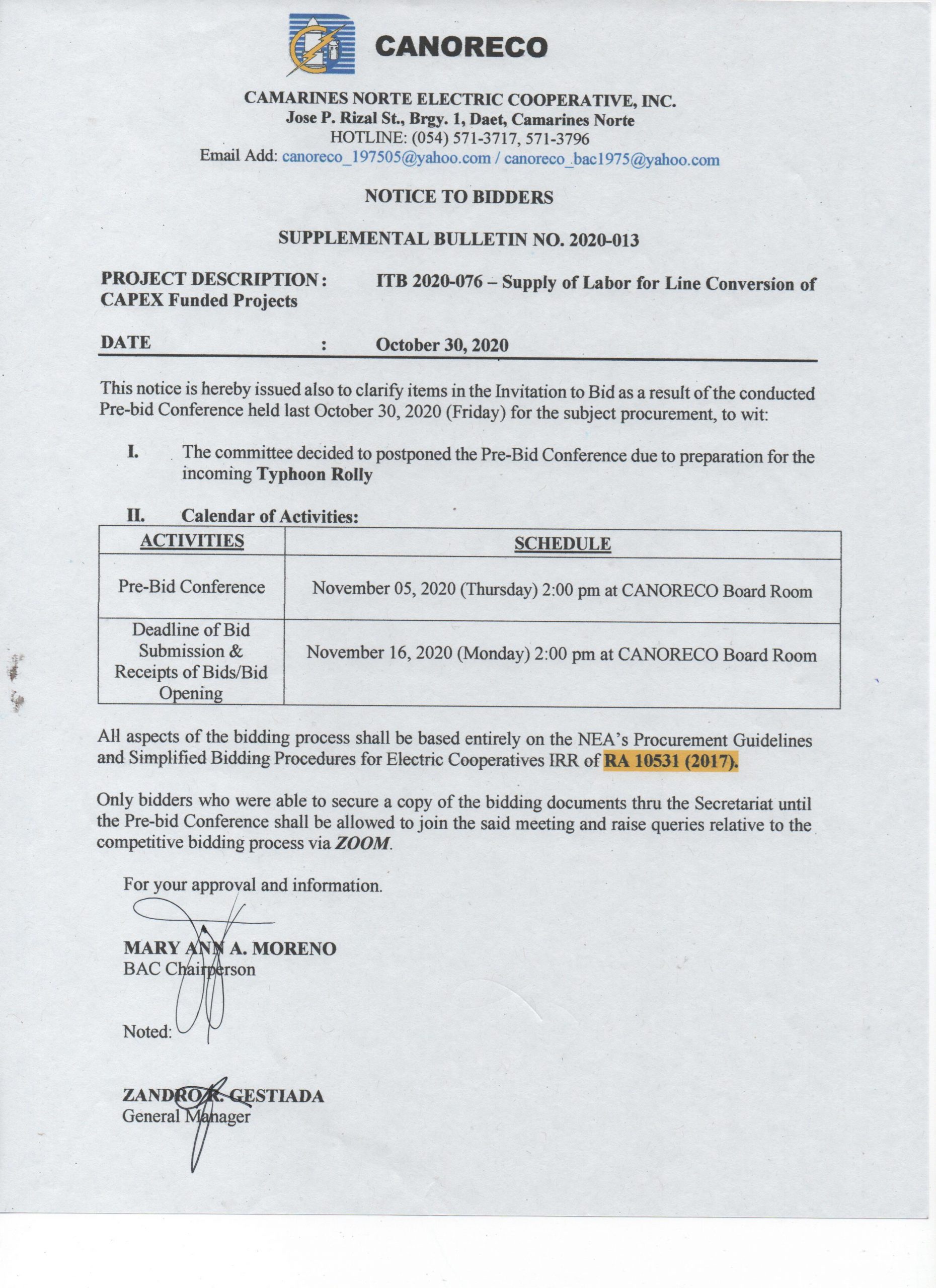 Invitation to Bid SUPPLEMENTAL BULLETIN FOR ITB 2020-076 Posted on November 3, 2020November 3, 2020 Author Comments Off on SUPPLEMENTAL BULLETIN FOR ITB 2020-076