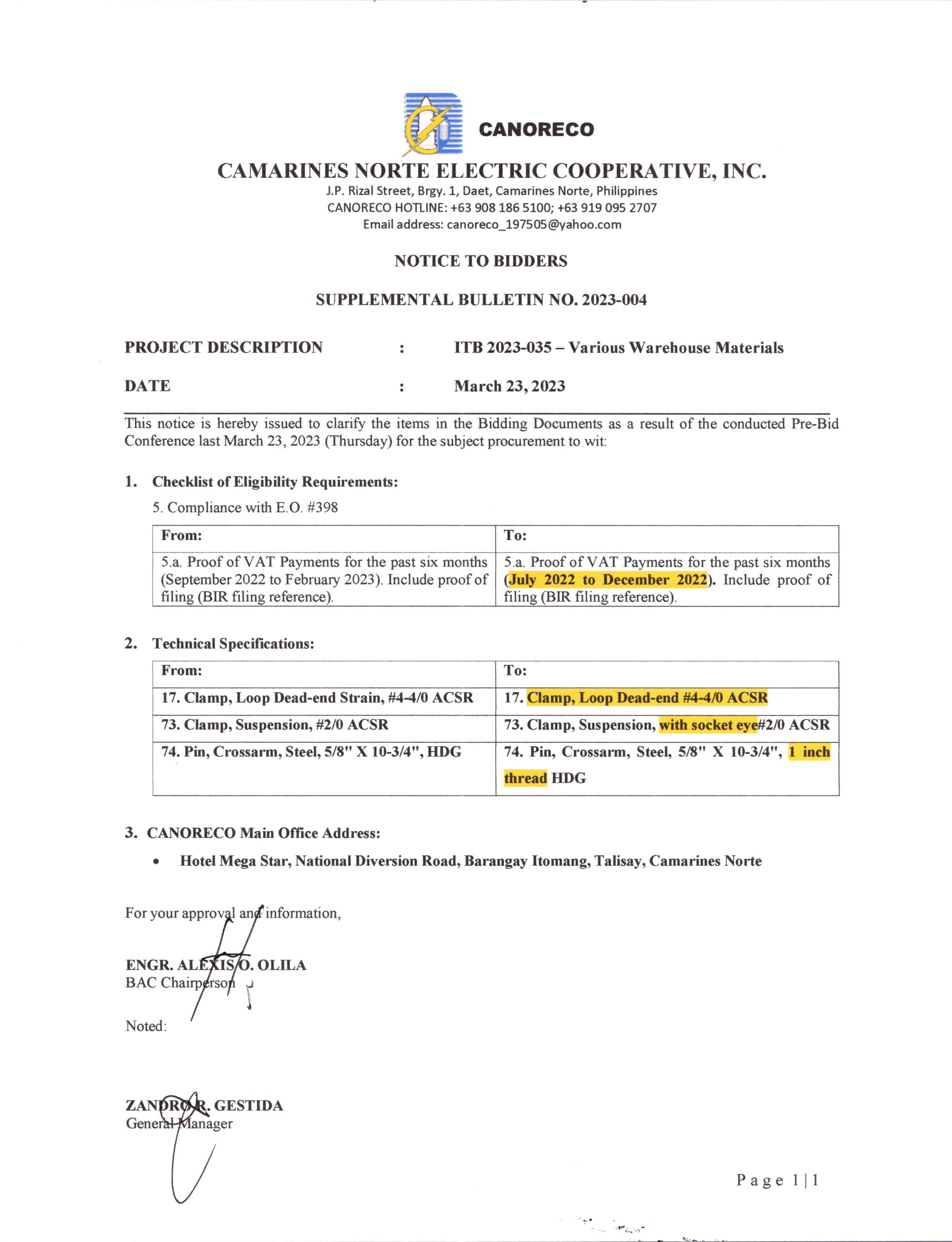 Invitation to Bid Supplemental Bulletin No. 2023-004 for ITB No. 2023-035 Posted on March 27, 2023March 27, 2023 Author Comments Off on Supplemental Bulletin No. 2023-004 for ITB No. 2023-035