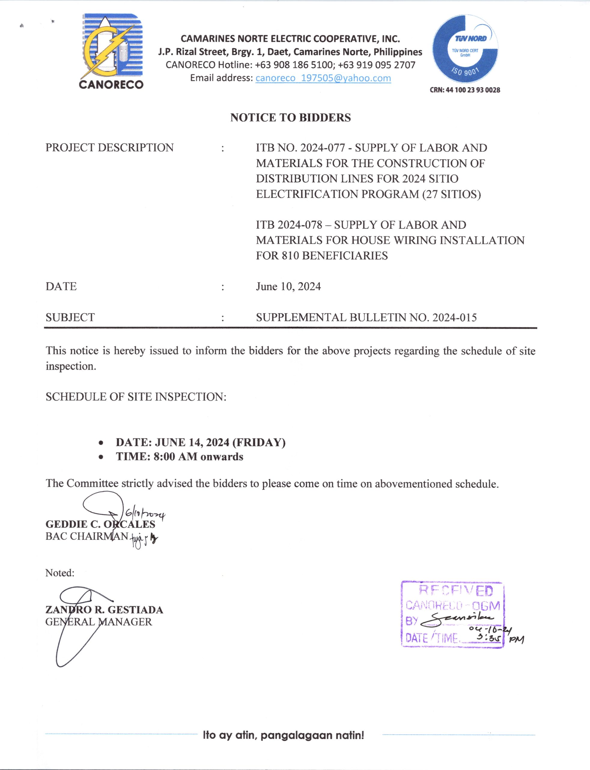 SUPPLEMENTAL BULLETIN NO. 2024-015 FOR ITB No. 2024-077 AND 2024-078