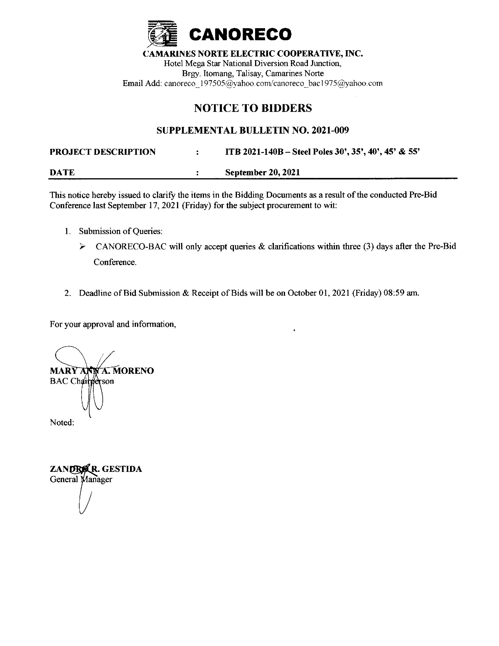 Invitation to Bid Supplemental Bulletin No. 2021-009 Posted on September 21, 2021September 21, 2021 Author Comments Off on Supplemental Bulletin No. 2021-009