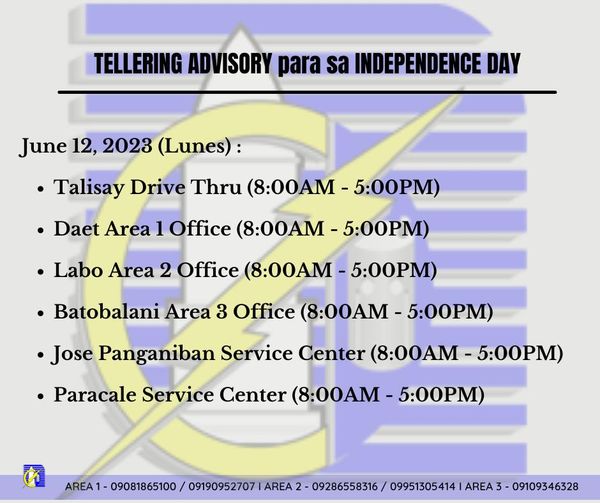 𝐁𝐀𝐒𝐀𝐇𝐈𝐍 𝐚𝐭 𝐀𝐋𝐀𝐌𝐈𝐍. Ang Special Tellering Schedule ng mga opisina ng CANORECO sa June 12, 2023 (Independence Day) kung saan maaaring magbayad ng bill sa kuryente. Pakidala lamang po ang electric bill o ang statement of account sa pagbayad.